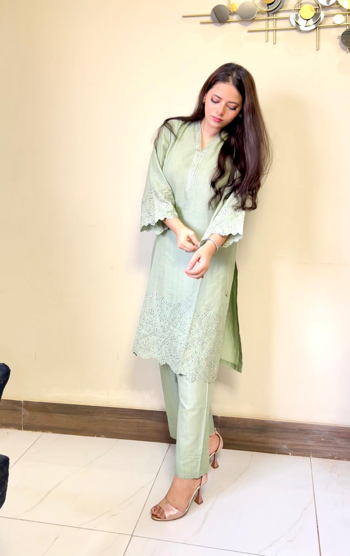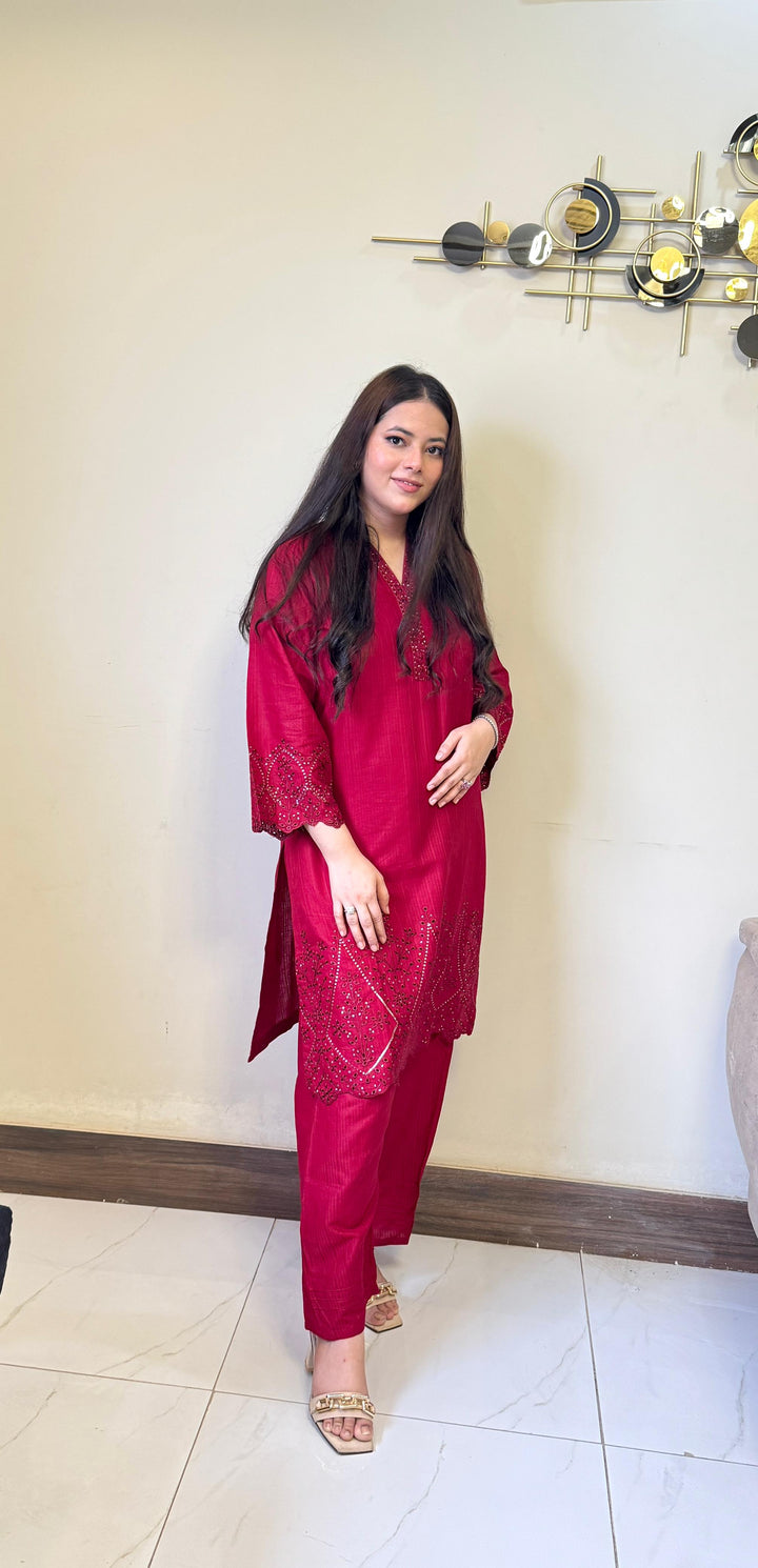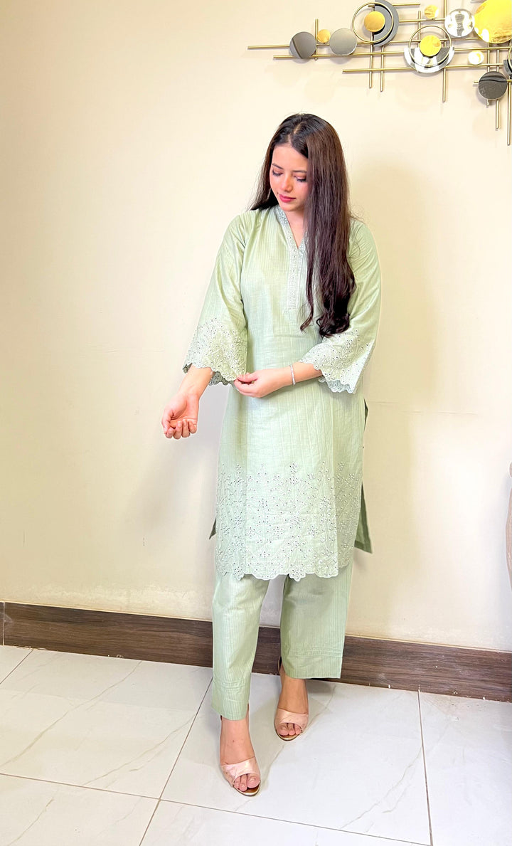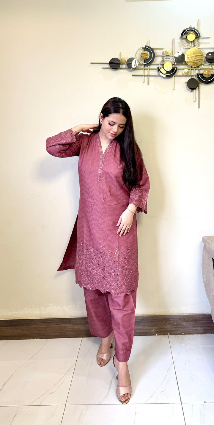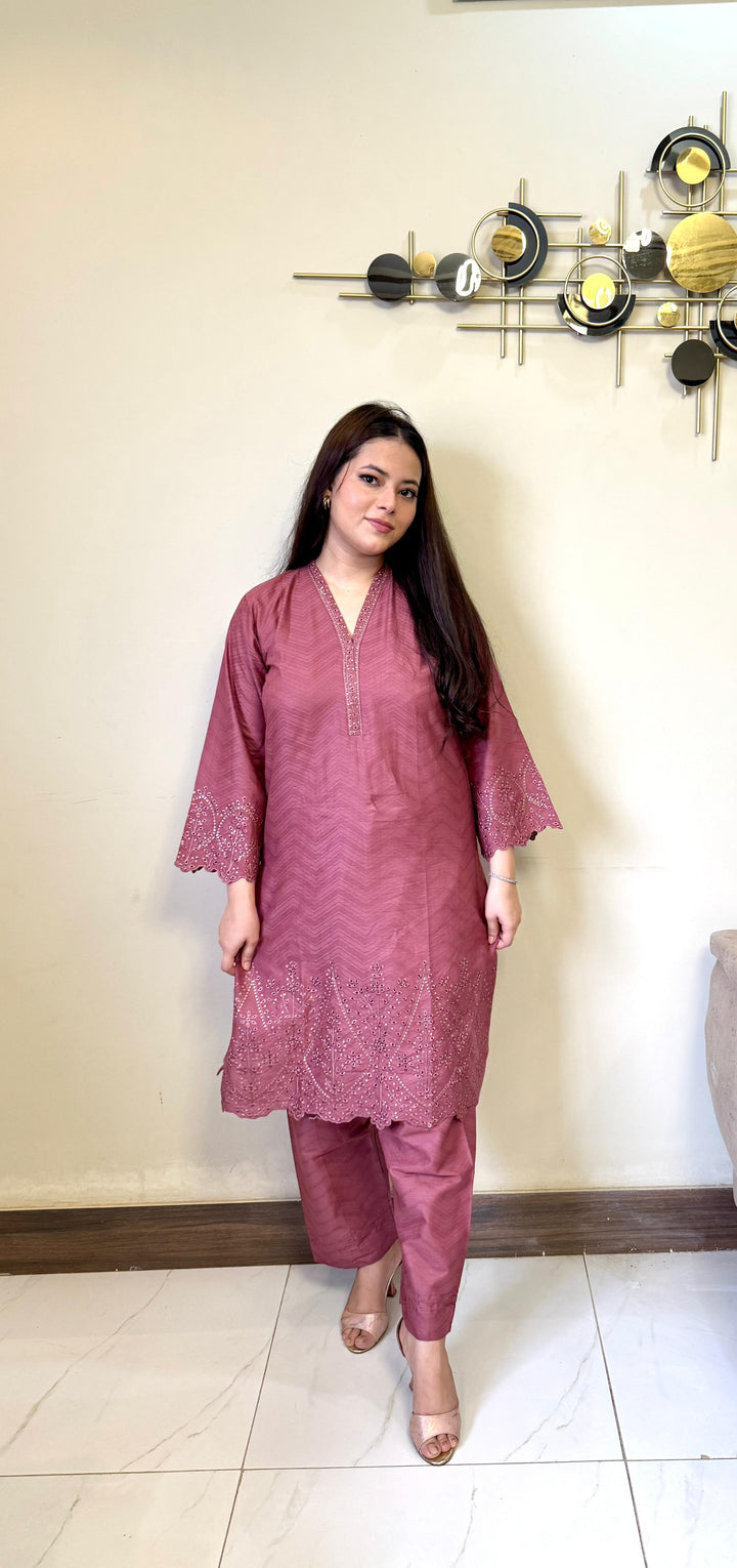 Diamond 2-Piece Embroidered Cotton Jacquard Set, crafted from luxurious cotton self jacquard fabric for all-day comfort and style. This elegant ensemble blends traditional charm with contemporary design, making it a versatile choice for both daytime elegance and evening poise.