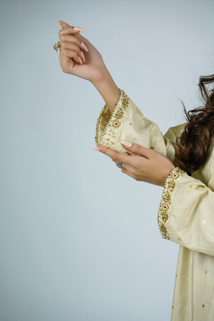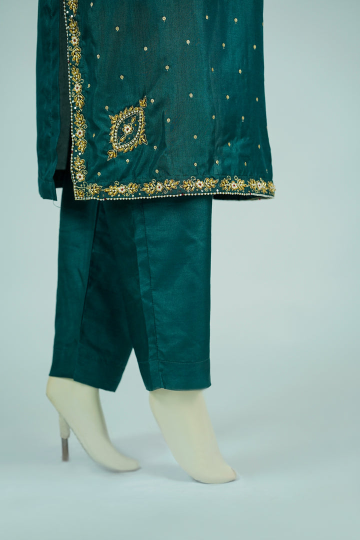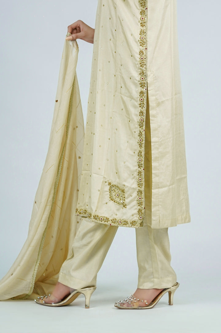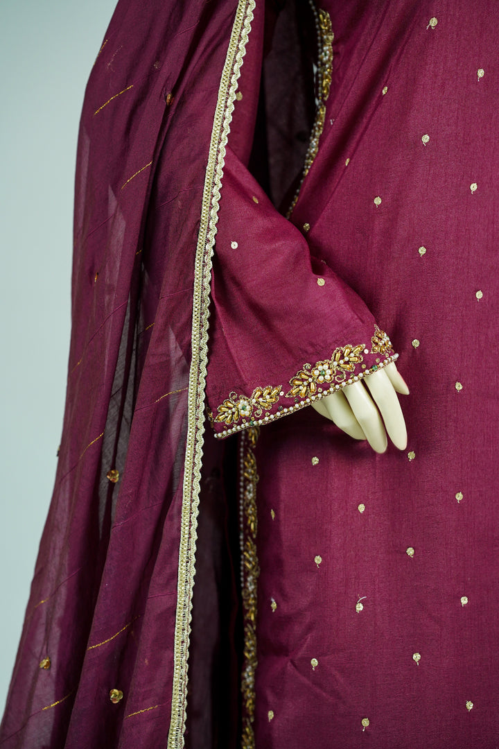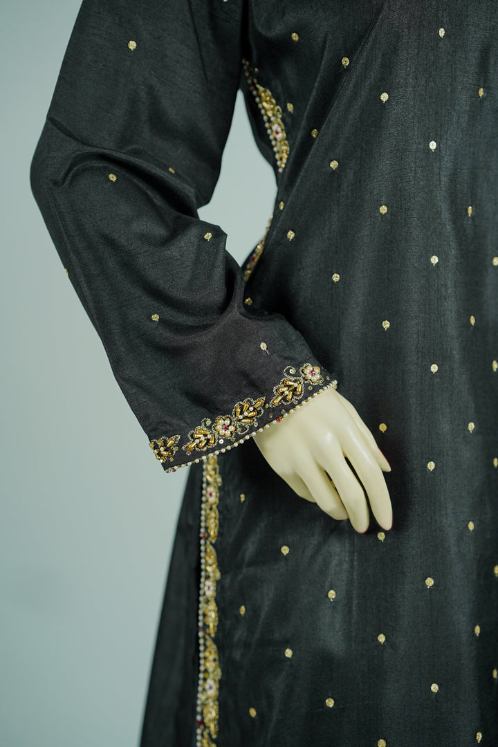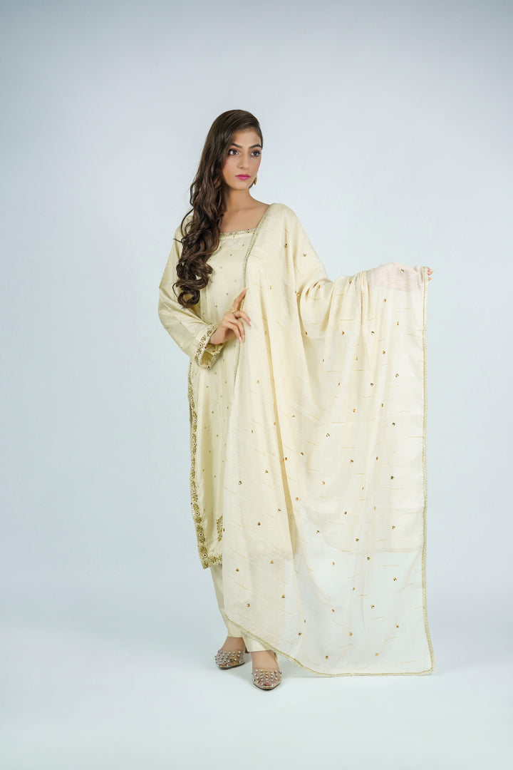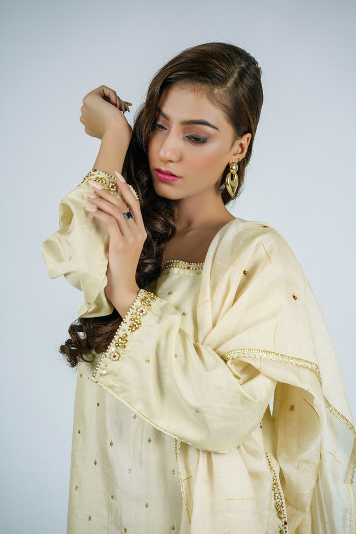 Shirt: The long-length shirt is made from luxurious Russian silk, richly adorned with exquisite handwork on the neckline, sleeves, and daman. Subtle delicate motifs on both sides of the shirt enhance its graceful charm and classic appeal.