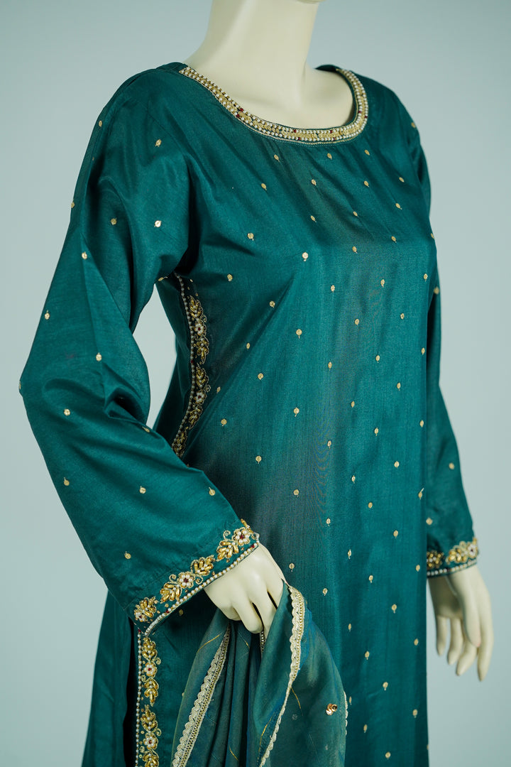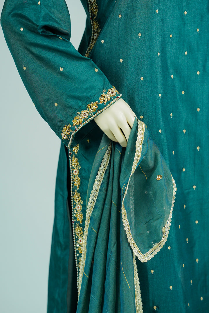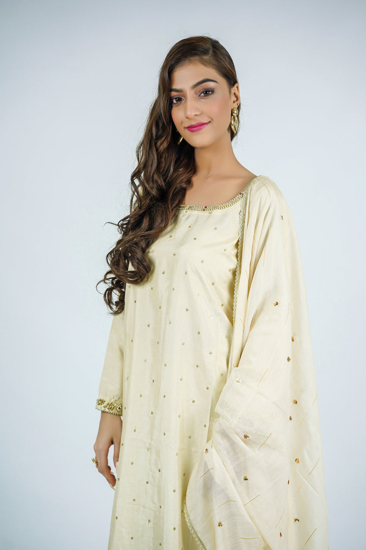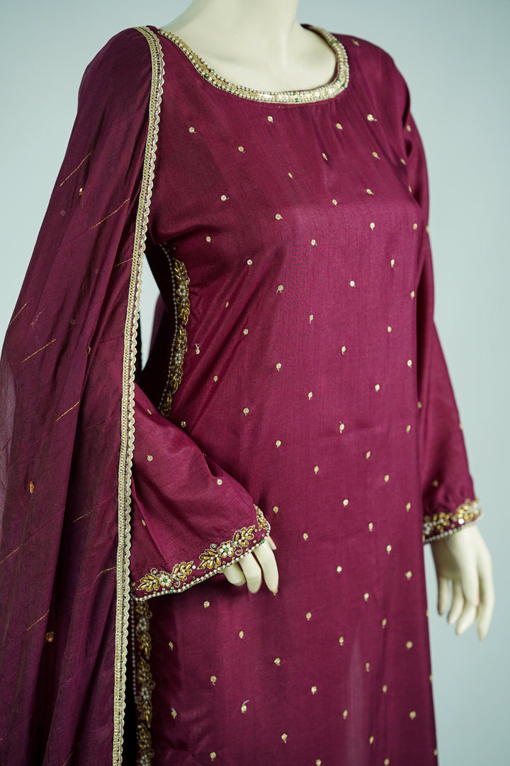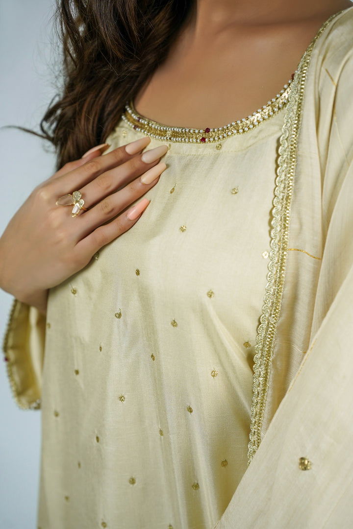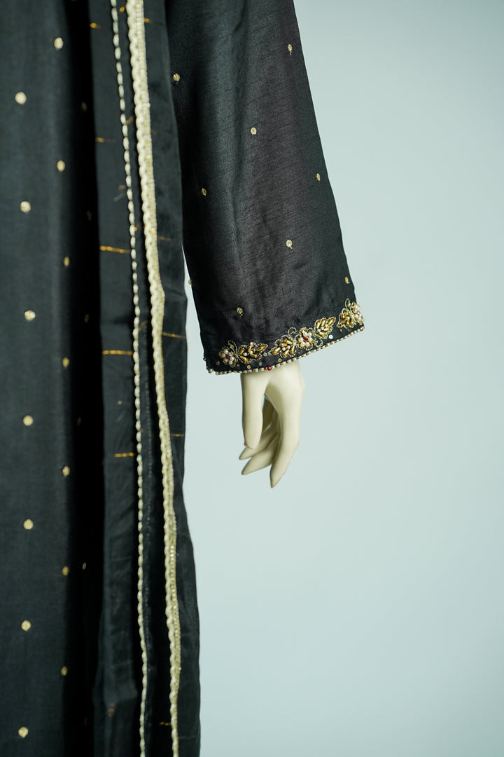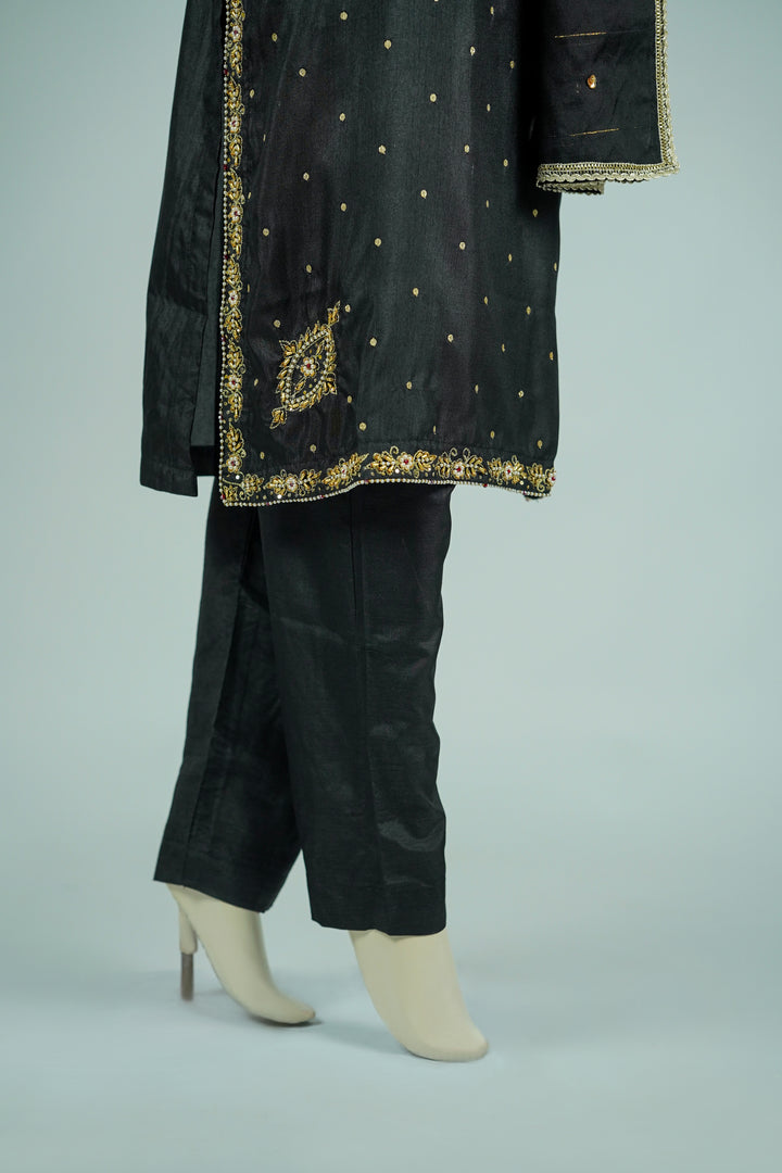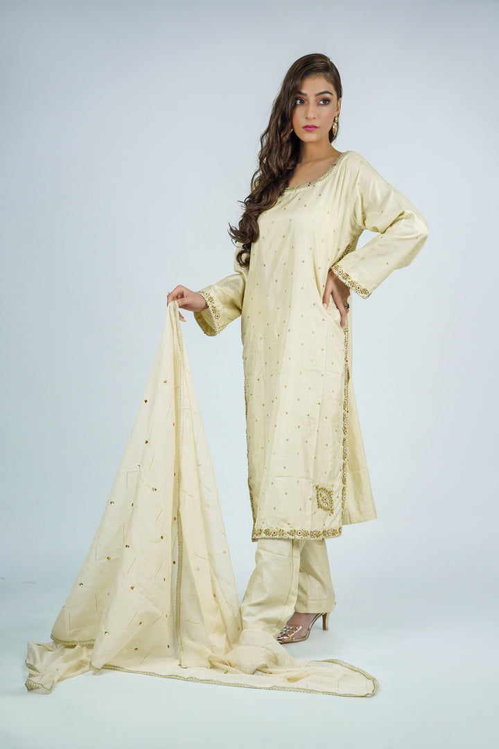 Shirt: The long-length shirt is made from luxurious Russian silk, richly adorned with exquisite handwork on the neckline, sleeves, and daman. Subtle delicate motifs on both sides of the shirt enhance its graceful charm and classic appeal.