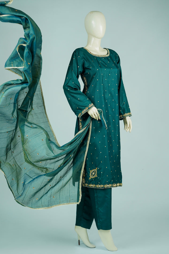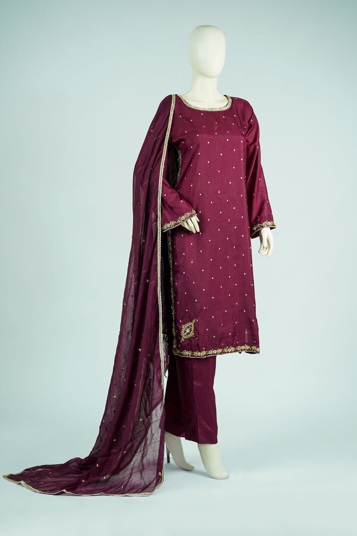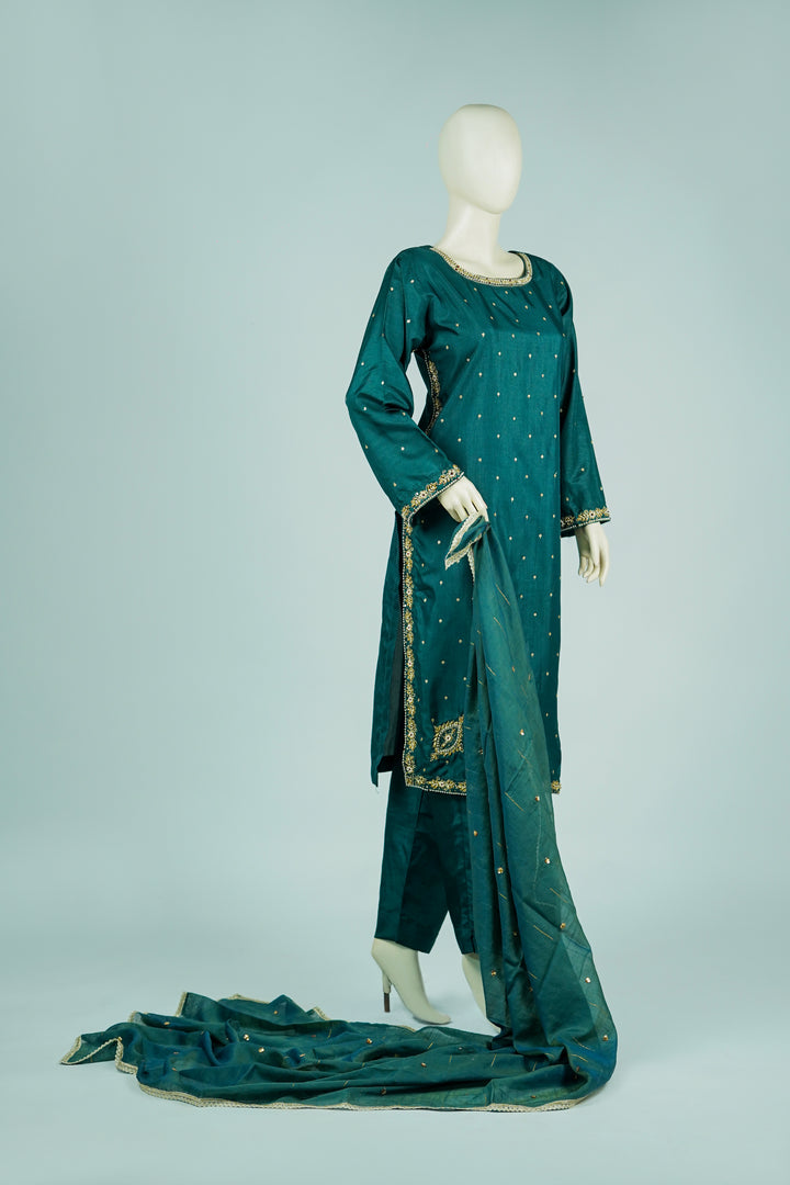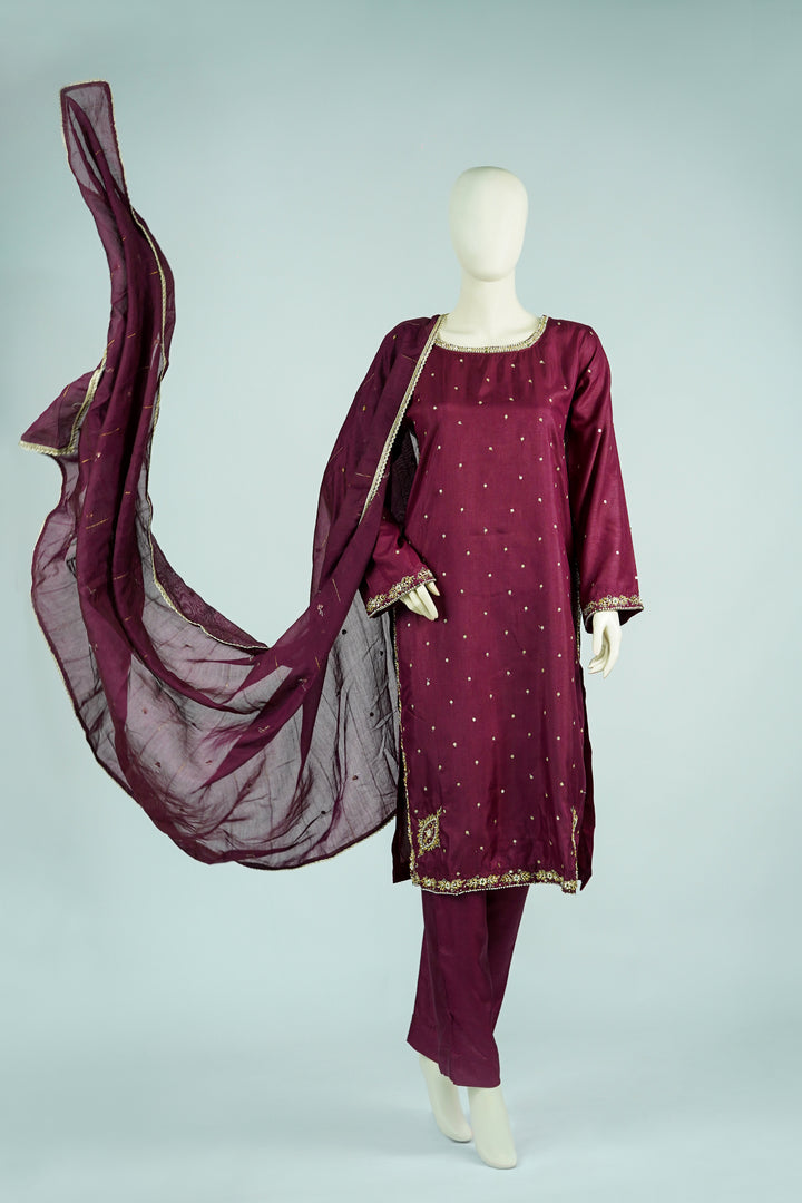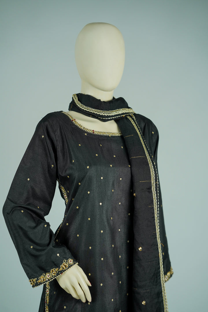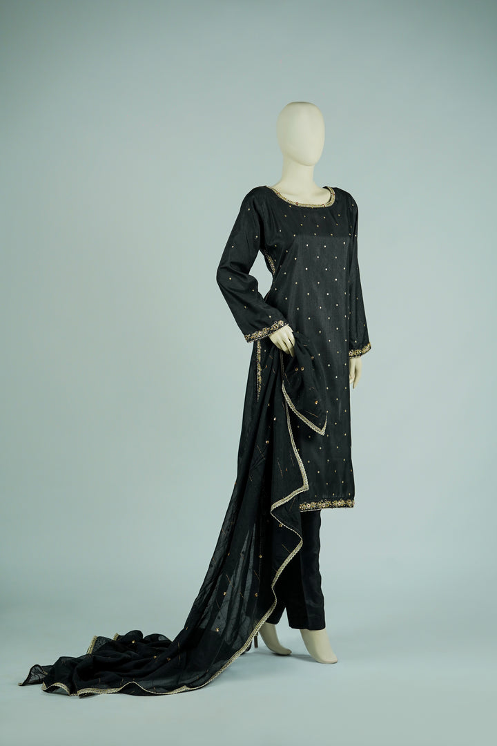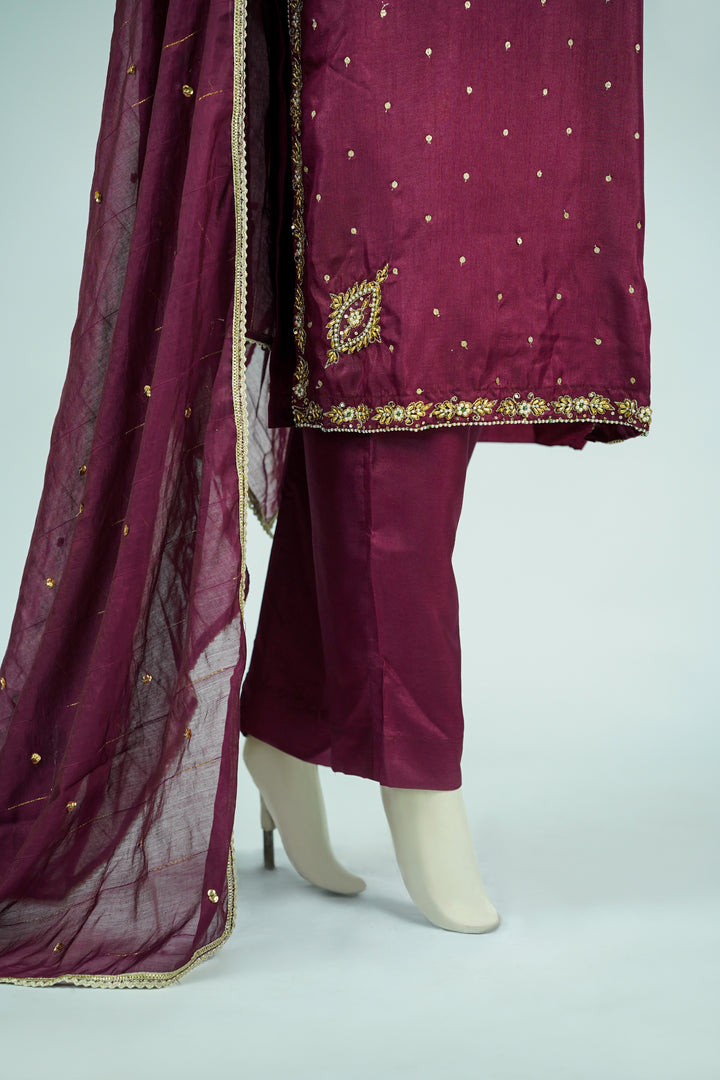Shirt: The long-length shirt is made from luxurious Russian silk, richly adorned with exquisite handwork on the neckline, sleeves, and daman. Subtle delicate motifs on both sides of the shirt enhance its graceful charm and classic appeal.