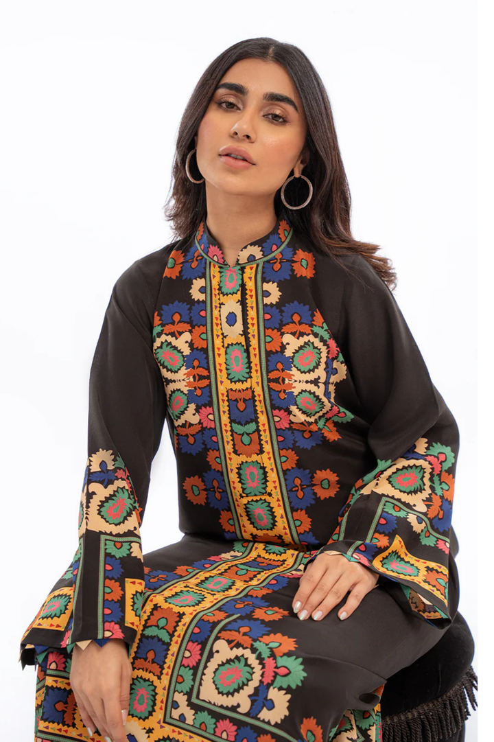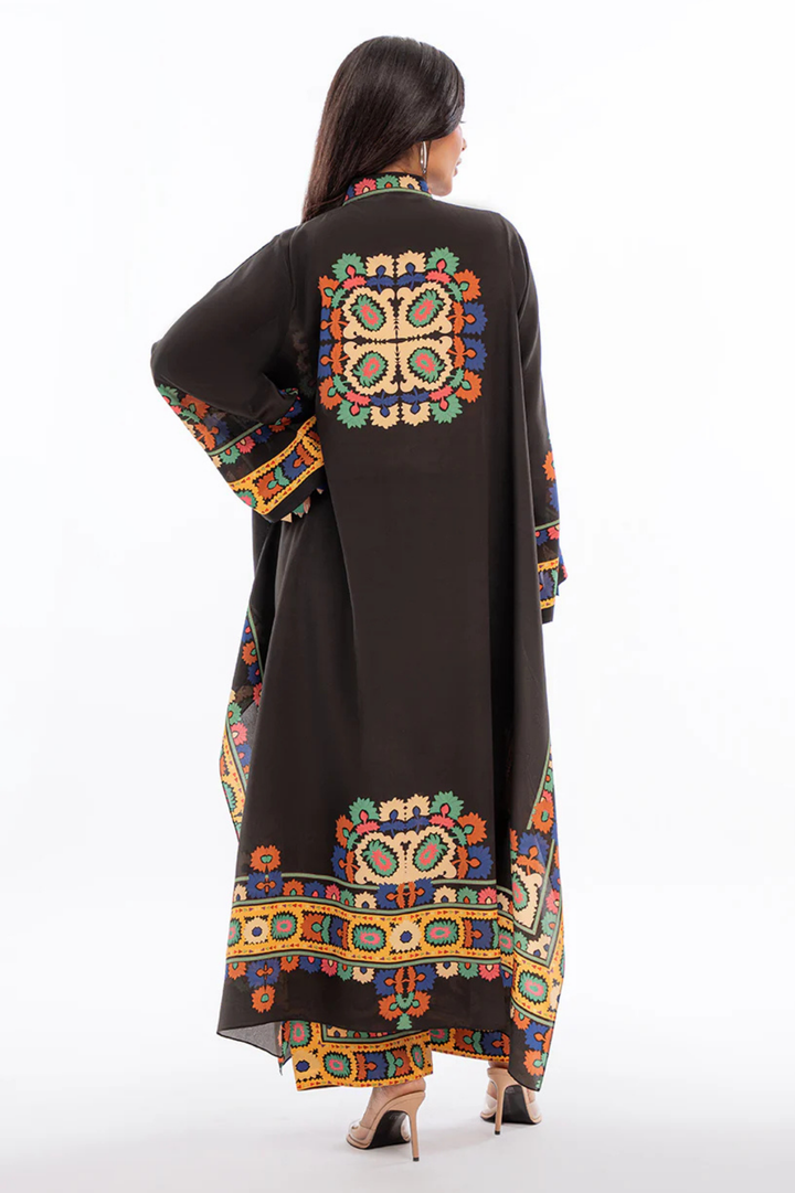 Make a bold cultural statement with Rosh’s Lalazar Kaftan Cord, tailored in luxurious crepe silk for a soft, fluid drape. The 50-inch kaftan showcases striking ethnic motifs in rich, vibrant tones — delivering a heritage-inspired aesthetic with a modern silhouette. Paired with a sleek bell-bottom trouser, this co-ord balances comfort, flair, and elevated sophistication.