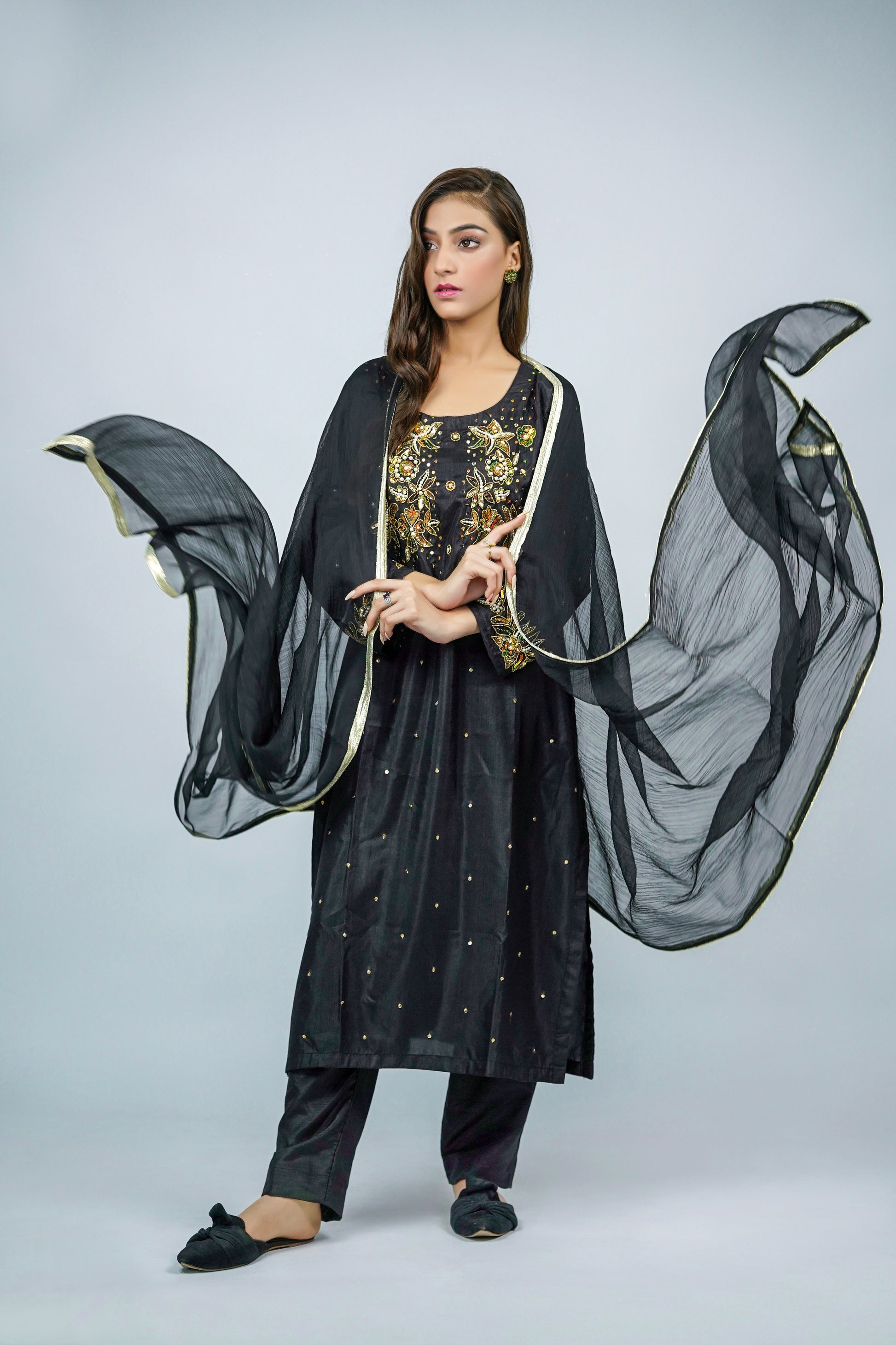 Dupatta: A lightweight chiffon dupatta adds graceful flow and balance, enhancing the outfit’s overall sophistication.