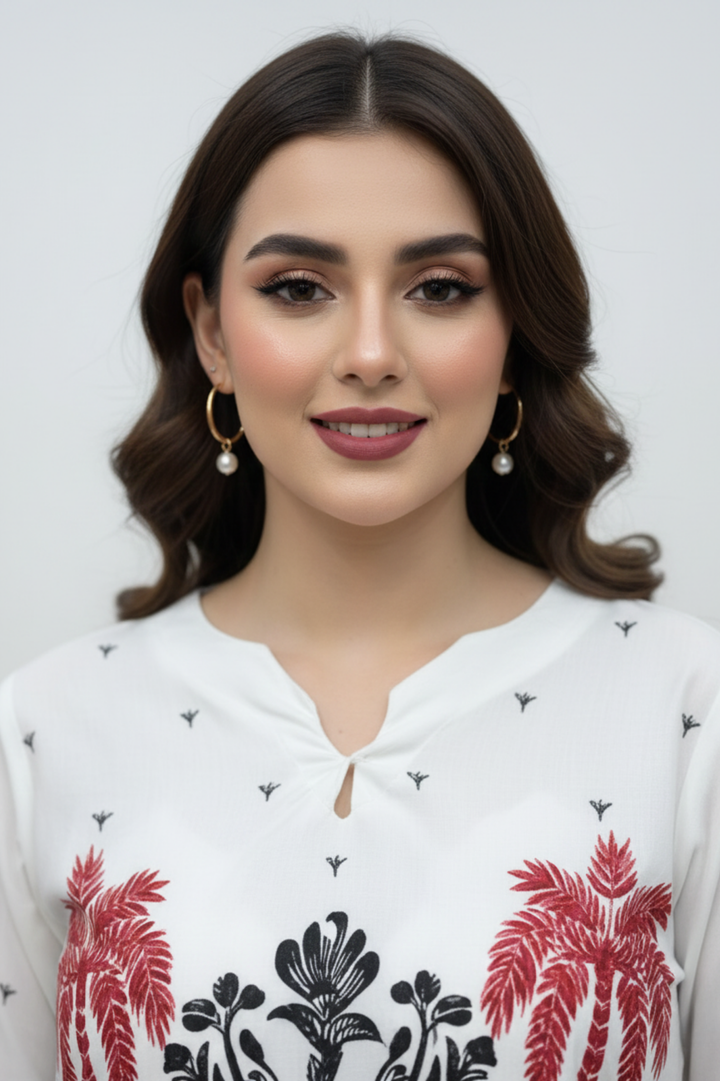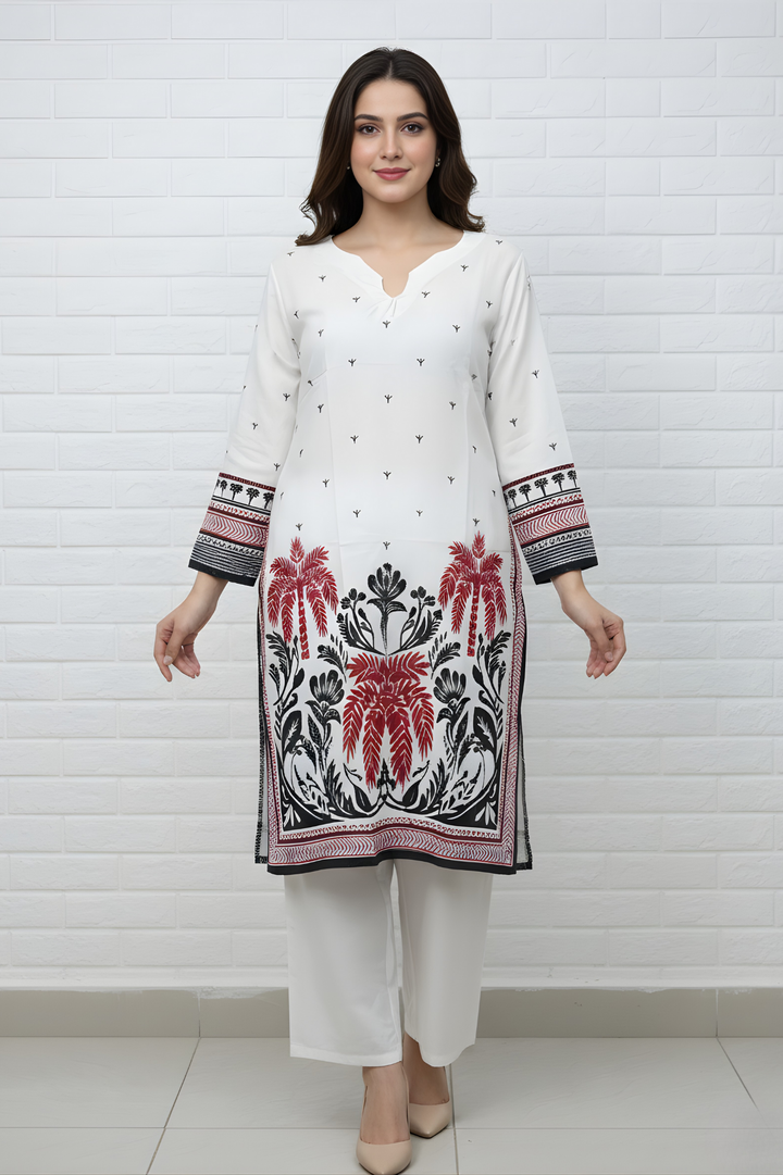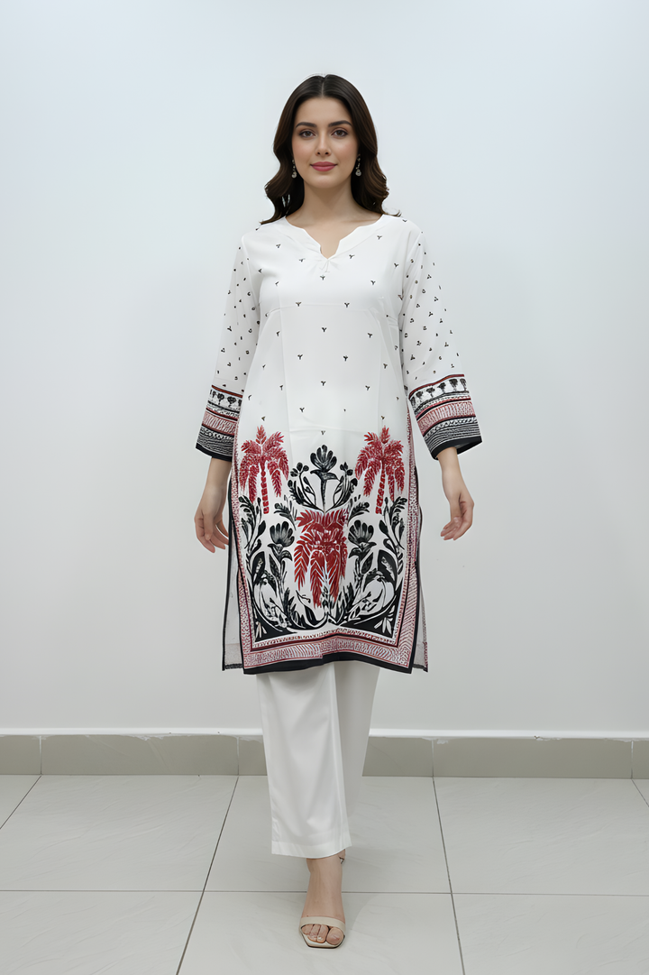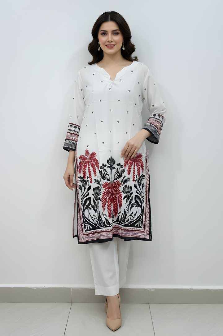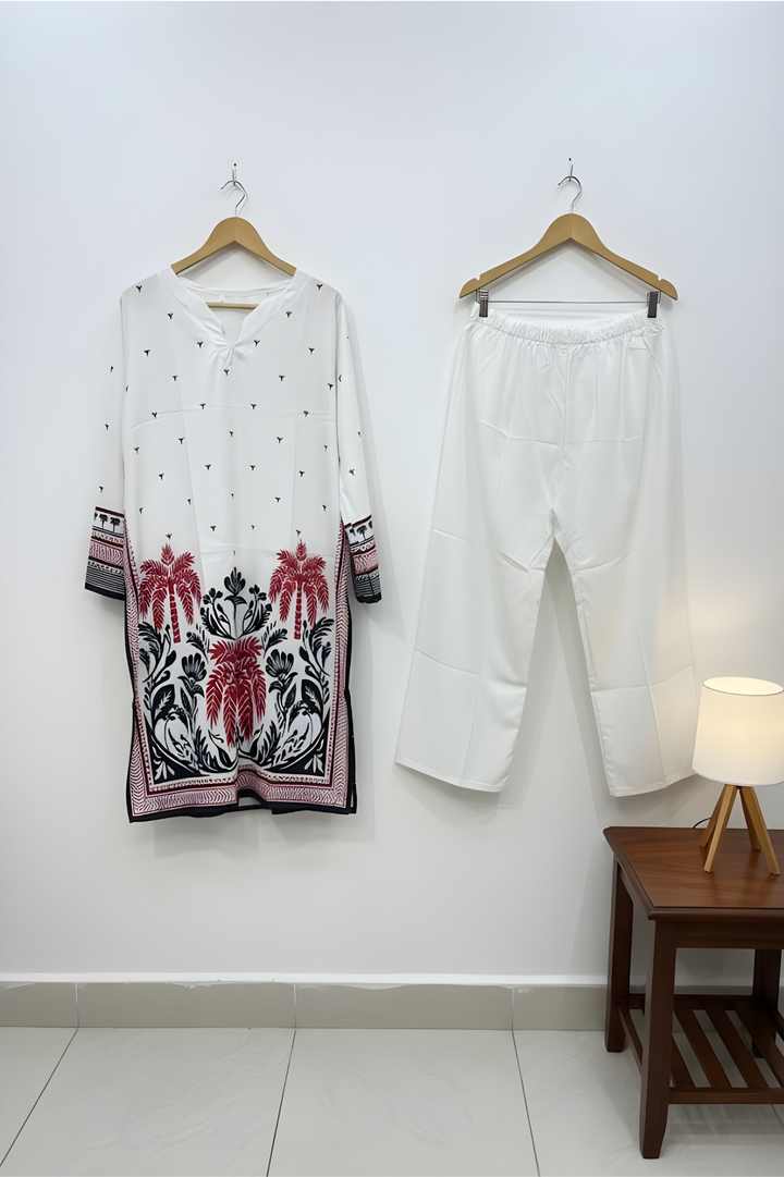 Where sophistication meets artistic expression — the Palm Noir Luxe Silk Set is crafted on smooth, flowy silk that drapes beautifully with every step. The ivory canvas is elevated with bold red and black palm motifs, adding an expressive contrast that turns minimalism into a statement.