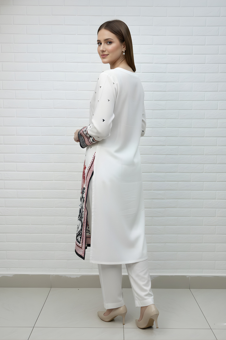 The kurta features a soft notch neckline and refined sleeve borders inspired by traditional patterns, while the matching silk trousers complete the look with an elegant fluid fall. Light, breathable, and effortlessly graceful — this set is made for women who appreciate luxury in subtle detail.
