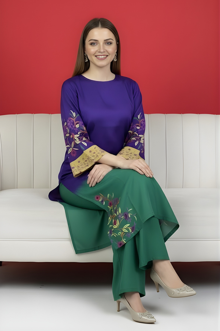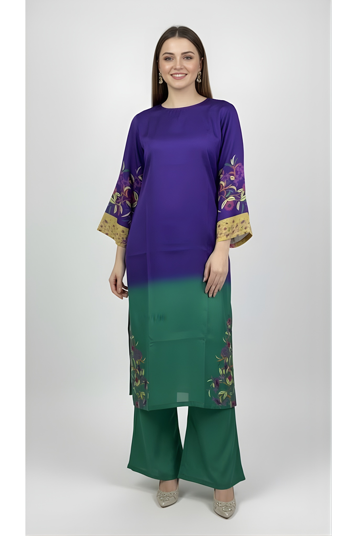 The Royal Iris Garden Silk Set brings together bold colour artistry and refined craftsmanship in one statement look. Designed in a rich royal-purple upper with a deep emerald lower transition, this two-piece ensemble showcases a stunning gradient effect that flows seamlessly from top to bottom.