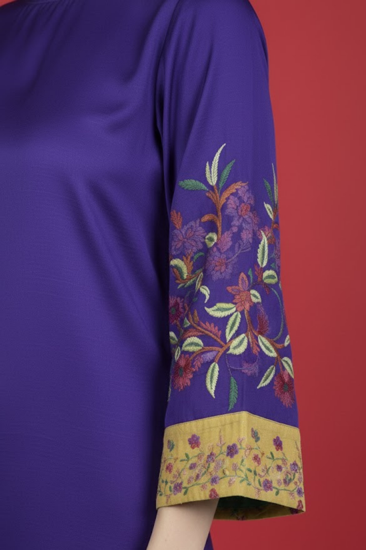 Intricate floral embroidery enhances the sleeves and hemline, rendered in multi-tonal threads that add depth, texture, and couture finesse. The contrasting mustard cuffs with delicate botanical motifs introduce a unique designer edge, making the overall look both vibrant and tastefully elevated.