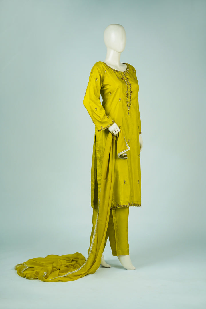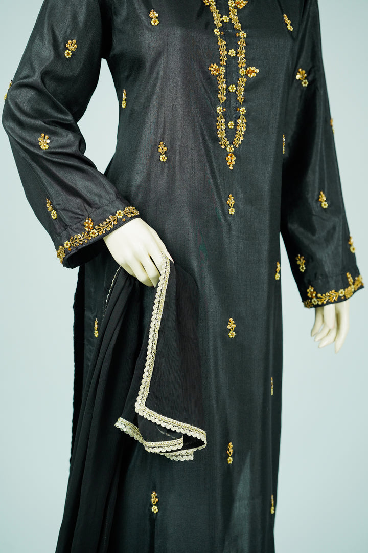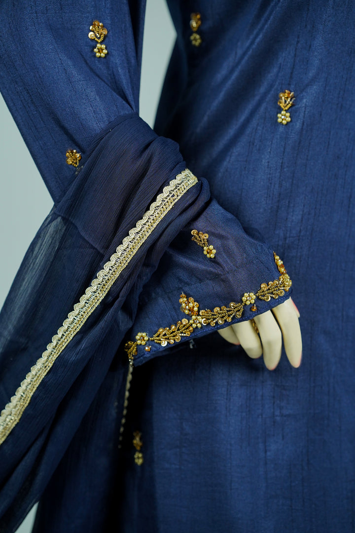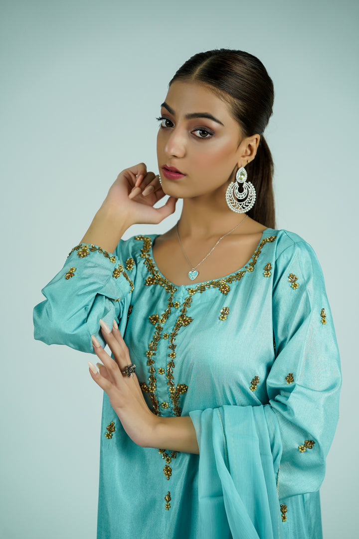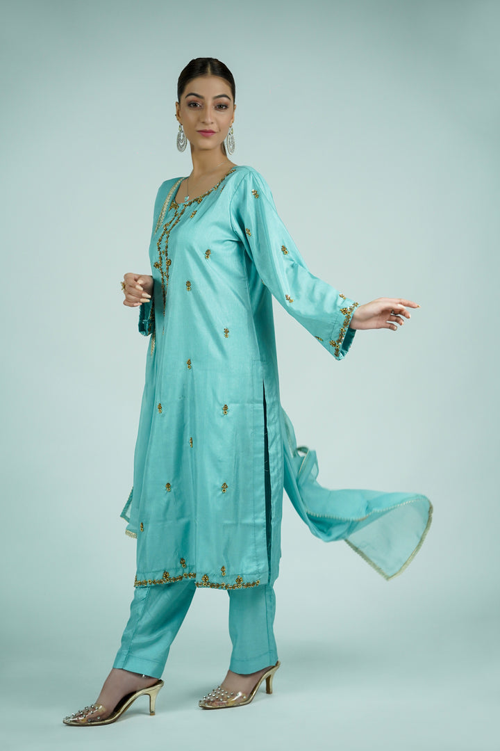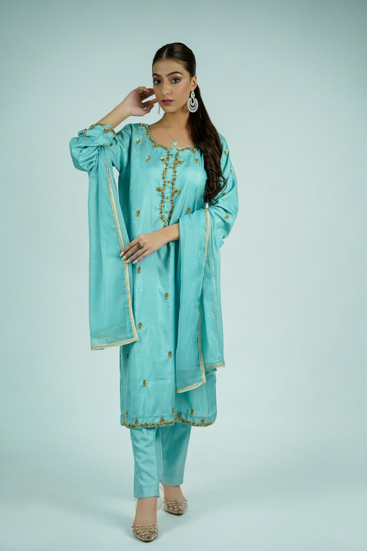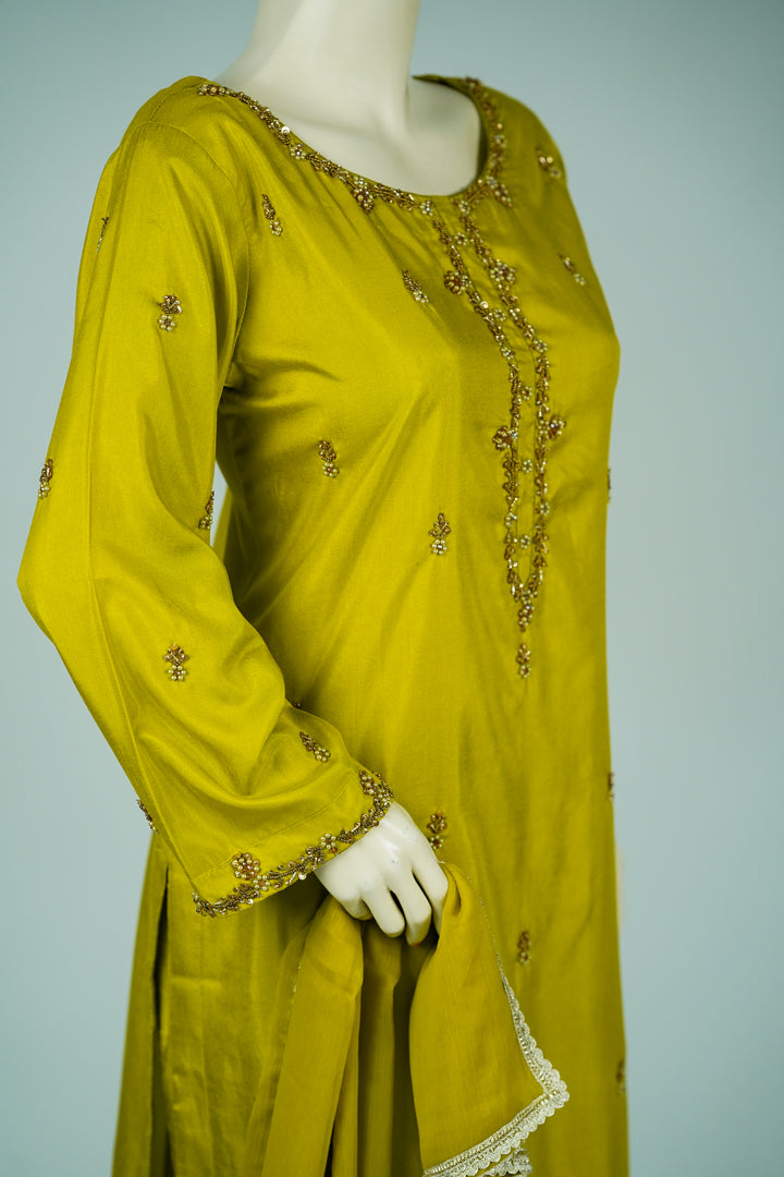 Safroon Handcrafted 3-Piece Russian Silk Ensemble, a luxurious outfit crafted to perfection for the modern woman with a taste for tradition. This design is a stunning blend of premium Russian silk, intricate hand embellishments, and graceful tailoring—ideal for weddings, festive celebrations, and formal gatherings.