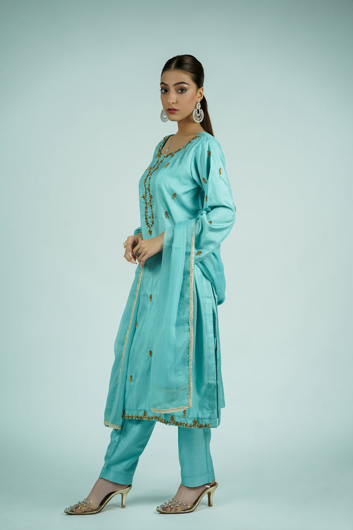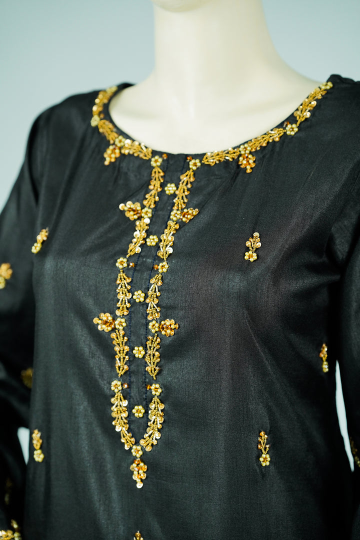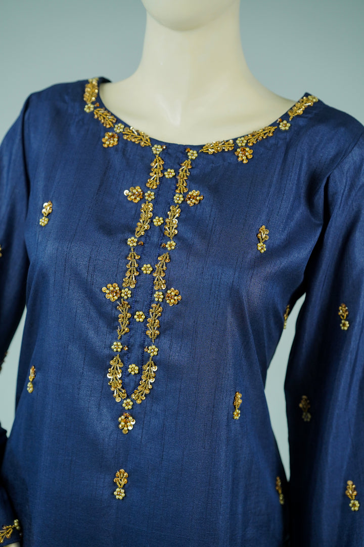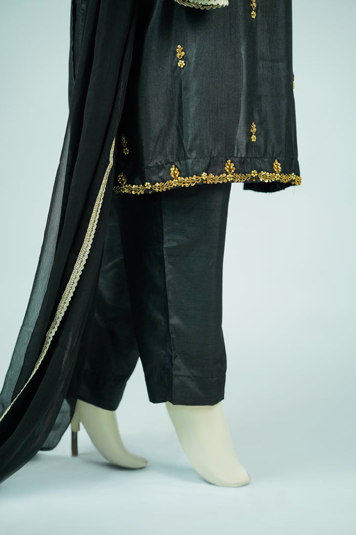 Shirt Fabric: Made from premium-quality Russian silk, known for its smooth finish and breathable texture—perfect for all seasons. The shirt is richly embellished with handcrafted kora dabka work, delicate detailing, and refined accents on the neckline, sleeves, and hem, exuding elegance from every angle. Comes with a soft inner lining for added comfort and structure.